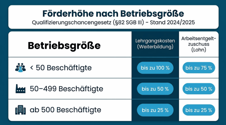Je nach Unternehmensgröße und Situation übernimmt die Agentur für Arbeit bis zu 100 % der Weiterbildungskosten und zusätzlich einen Zuschuss zum Arbeitsentgelt während der Weiterbildung.